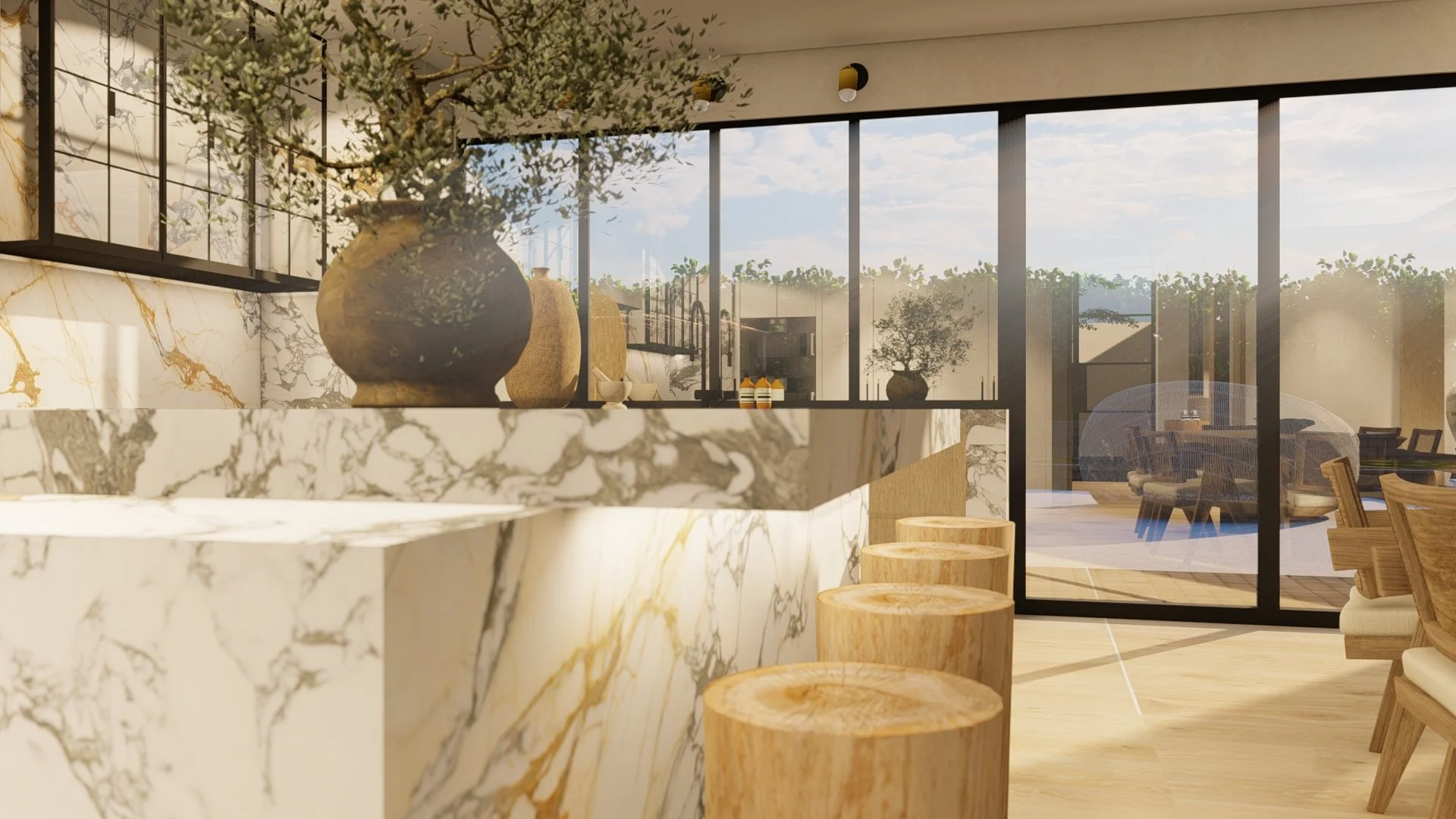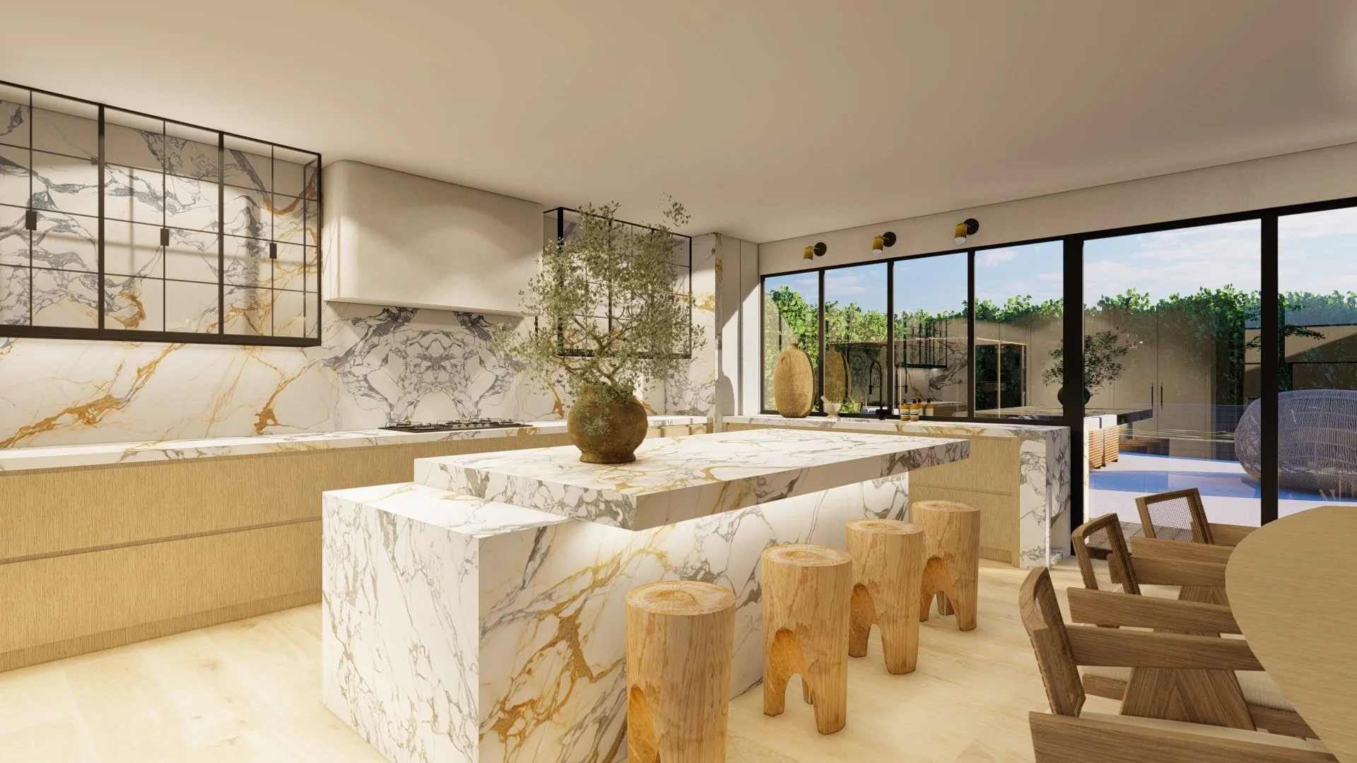 Natural Oak, Borghini Marble, & exquisite slab detailing define this Kitchen while collapsible windows open to the backyard.