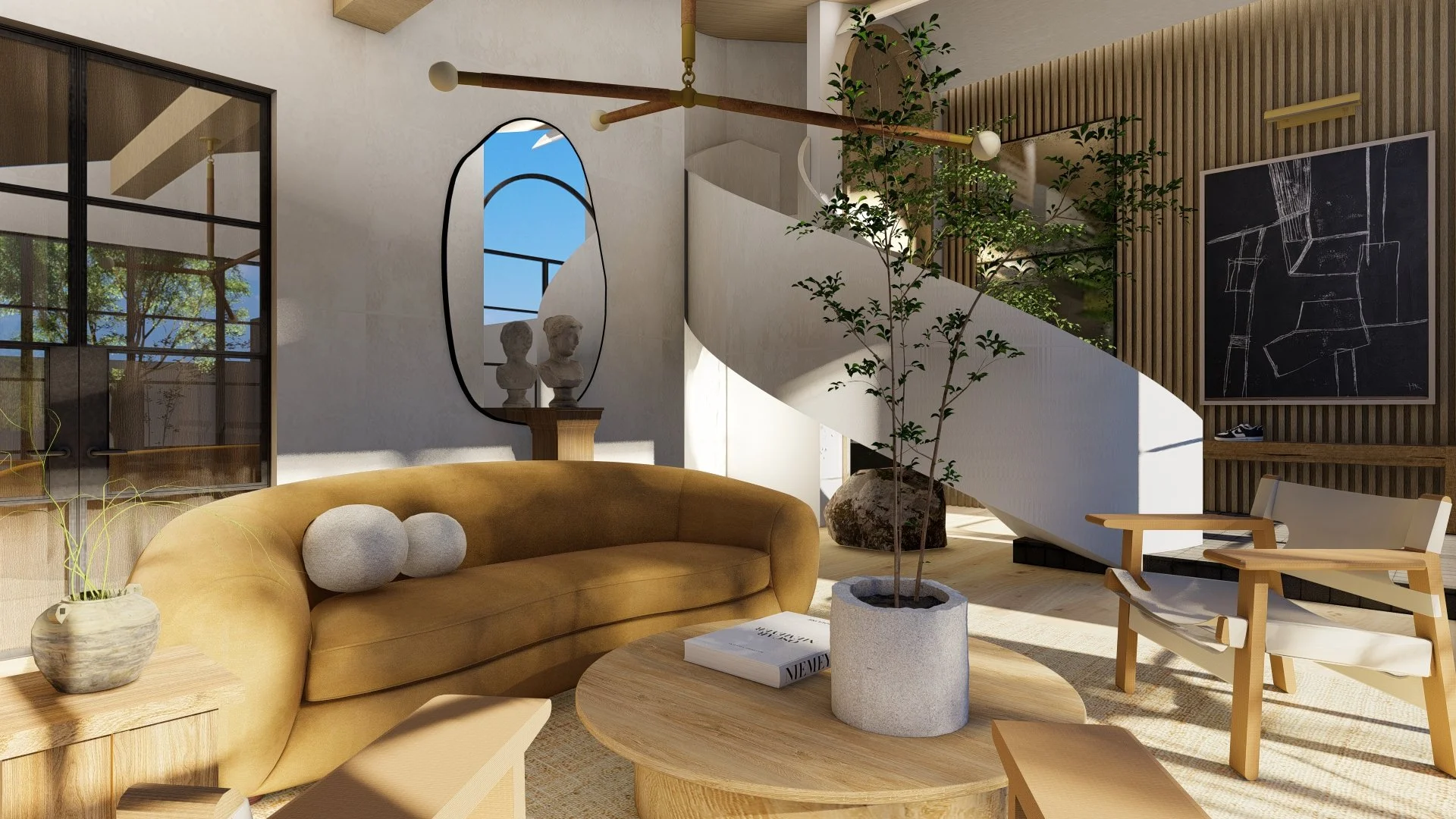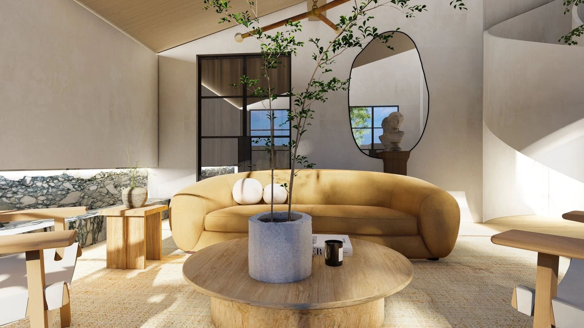 A formal Living Room has views into the courtyard with a mature oak tree.