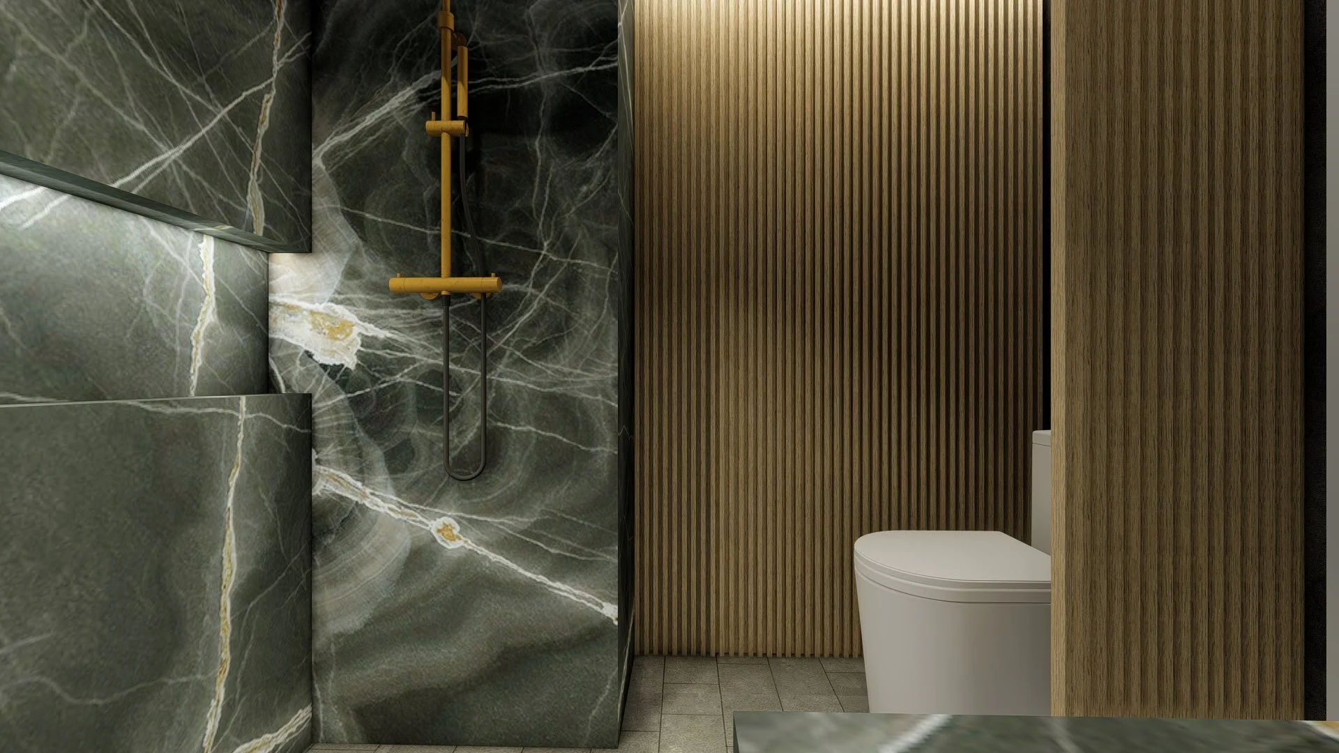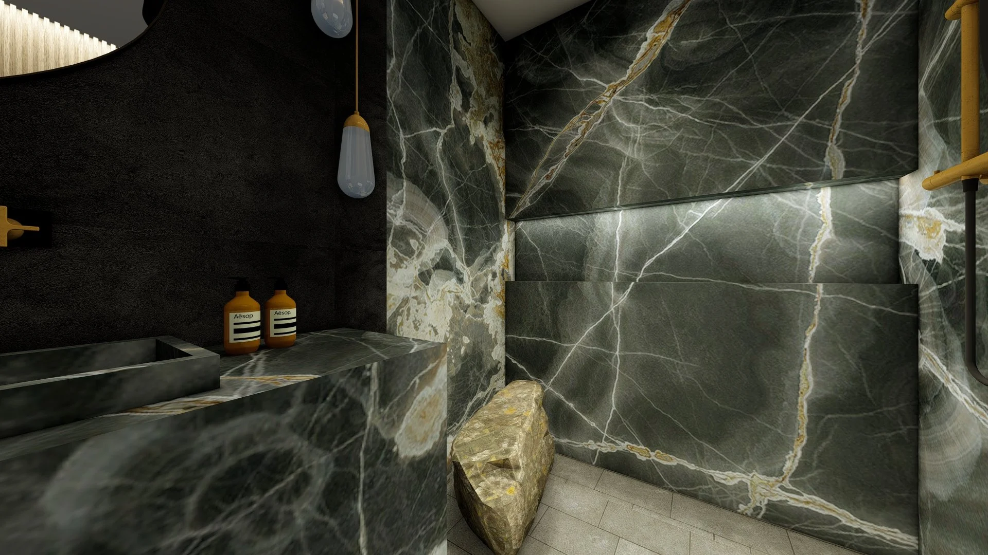 A honed black onyx slab serves as the feature for this moody Powder Room with a boulder featured as a shower bench.