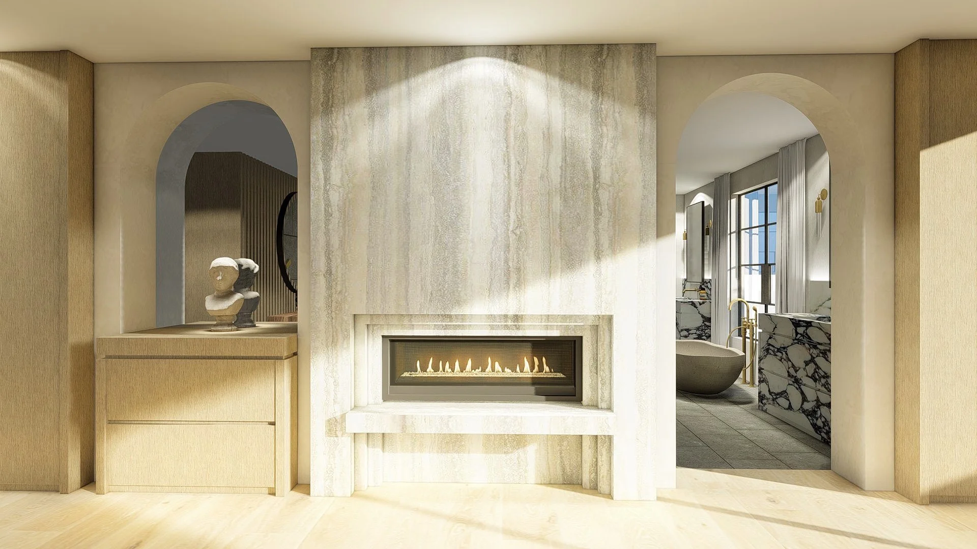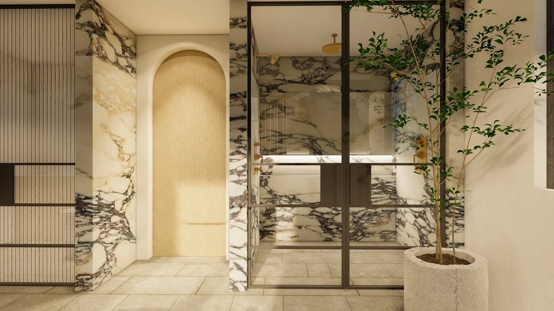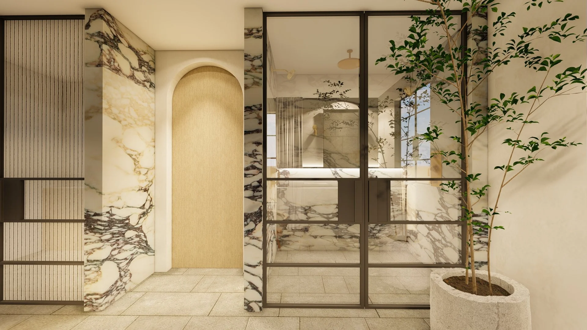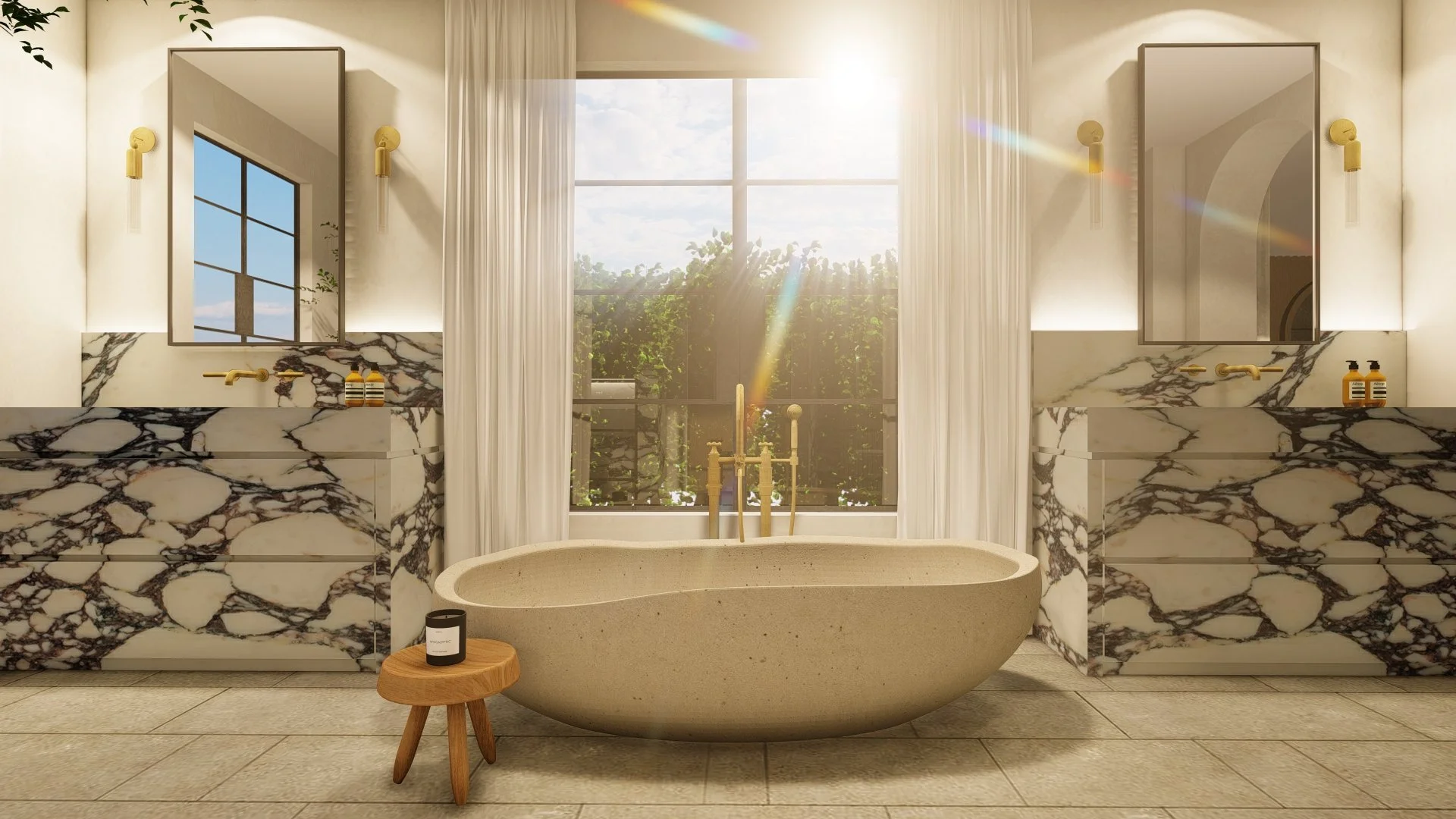 A dramatic entrance with book matched Calacatta Viola Marble vanities and a limestone freestanding tub create a spa like ambiance.